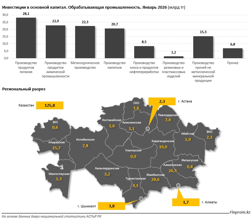 "По итогам января 2026 года, лидером по объёму инвестиций стало производство продуктов питания — 28,1 млрд тенге. Химическая промышленность заняла второе место с показателем 22,9 млрд тенге, металлургия — третье с объёмом 22,3 млрд тенге. Существенный результат продемонстрировало и производство напитков — 20,7 млрд тенге", - подчитали аналитики издания.