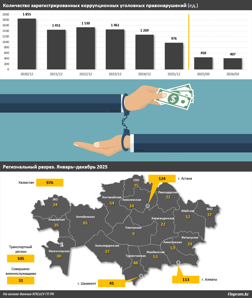 Анализируя данные КПСиСУ ГП РК, можно отметить, что в прошлом году и в первом квартале 2026-го количество регистрируемых коррупционных уголовных дел уменьшилось: на 23,1% и на 9,6% соответственно, передает inbusiness.kz со ссылкой на Ranking.kz.