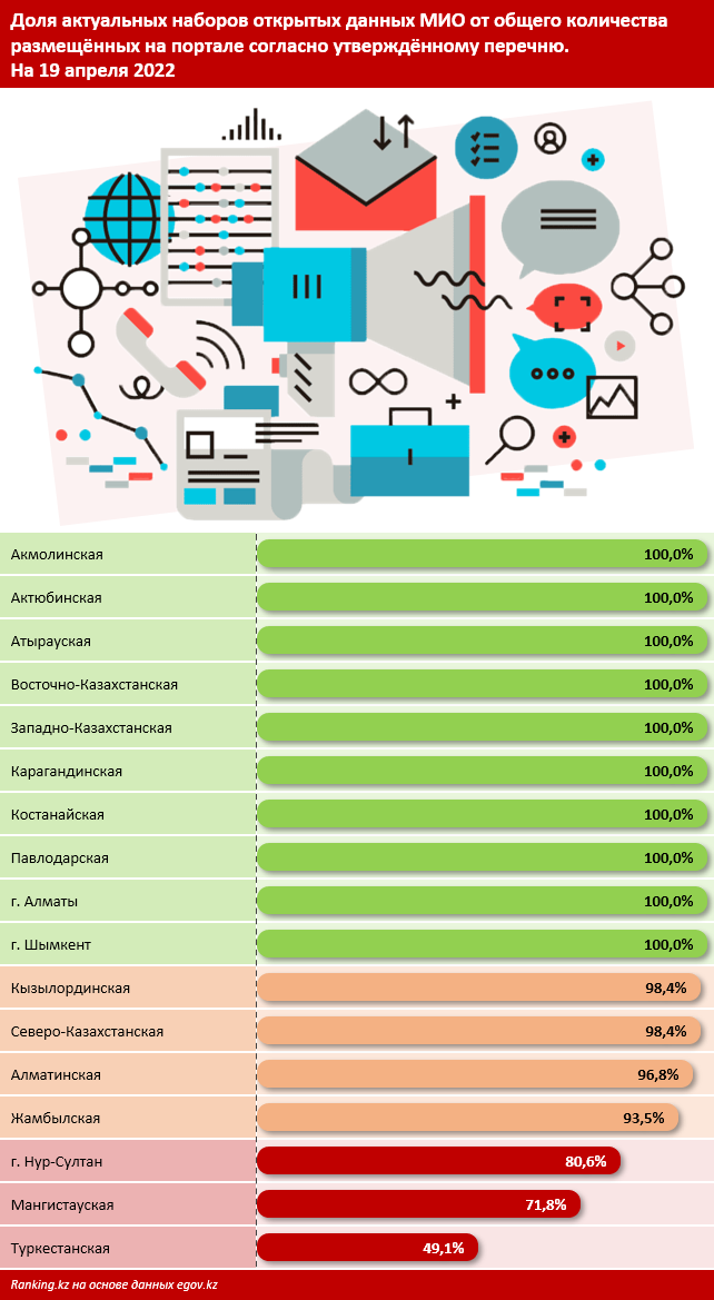 Исключение составили Туркестанская, Атырауская и Мангистауская области. В Туркестанской области опубликовали всего 88,7% утверждённых открытых данных, в Атырауской — 67,7%, в Мангистауской — 62,9%. Соответственно, акиматы перечисленных регионов не следуют своим обязанностям в части публикации данных и не выполняют обязанности, предписанные статьями 9 и 17 Закона РК "О доступе к информации" от 16 ноября 2015 года (№ 401-V ЗРК).