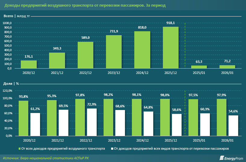 "Положительная динамика сохраняется и в 2026 году. В январе доходы от авиаперевозок пассажиров составили 71,2 млрд тенге против 63,3 млрд тенге годом ранее. Рост достиг 12,5%, что подтверждает устойчивый спрос на авиаперелёты", - пояснили эксперты.