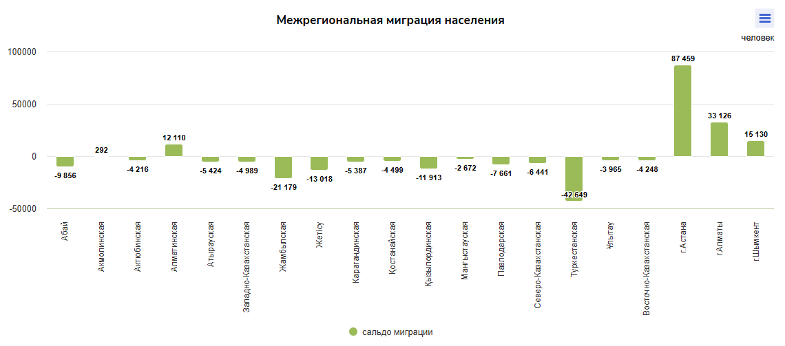"Наибольший миграционный прирост зафиксирован в городе Астане — 87 459 человек. В Алматы положительное сальдо составило 12 110 человек, в Шымкенте — 15 130 человек, в Алматинской области — 33 126 человек", - рассказали в Бюро национальной статистики.