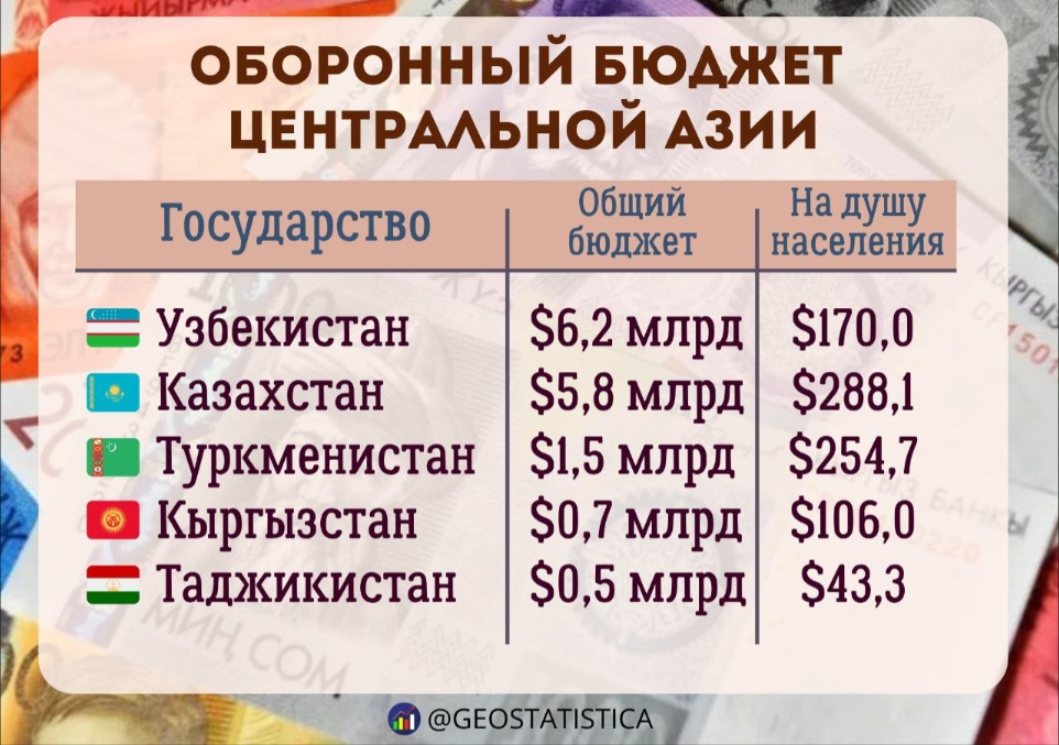 Узбекистан обладает крупнейшим военным бюджетом в Центральной Азии. На 2026 год на оборону Ташкент заложил 6,2 млрд долларов. За ним следует Казахстан, который намерен потратить на эти нужды 5,8 млрд долларов, передает inbusiness.kz со ссылкой на телеграм-канал "Геостатистика".