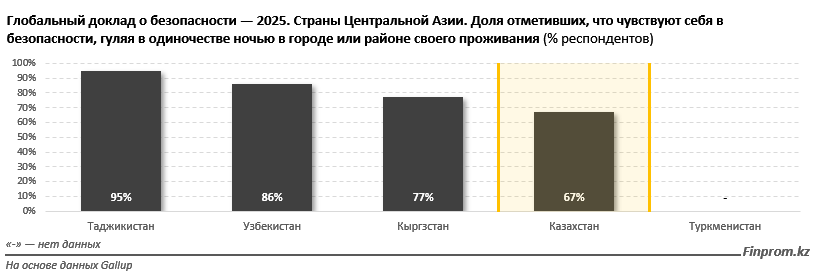 В Казахстане доля респондентов, ощущающих себя в безопасности, гуляя в одиночестве ночью в городе или районе своего проживания, оказался ниже среднемирового значения: 67%. По Туркменистану нет данных.