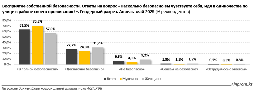 Между тем, по данным Бюро национальной статистики (БНС) АСПиР РК, согласно опросу, который касался восприятия собственной безопасности, проведённому в апреле и мае 2025 года среди 18 тыс. казахстанцев в возрасте от 15 лет, показатели были несколько иными.