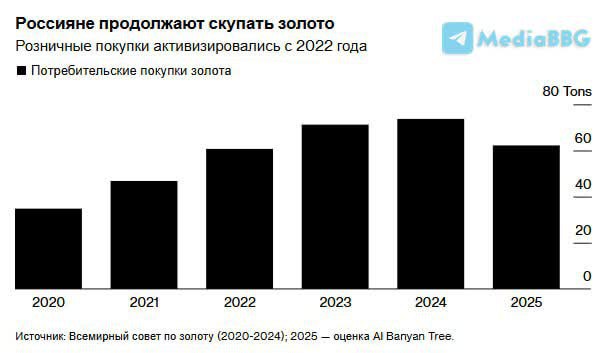 По данным Al Banyan Tree Research, в 2025 году объем розничных покупок слитков, монет и ювелирных изделий в России достигнет 62 тонн, что сопоставимо с золотыми резервами Испании.