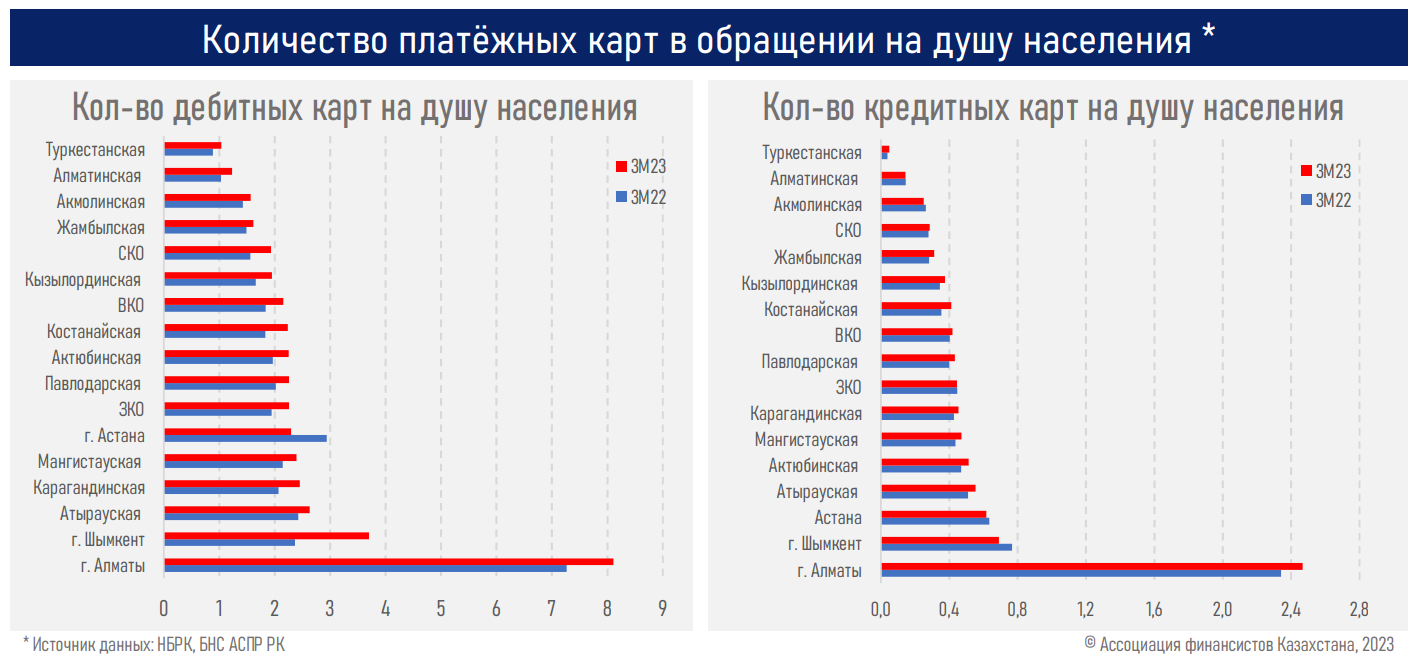 В разрезе регионов снижение зафиксировано лишь в г. Астана (−0,6 млн), вследствие чего количество дебитных карт на душу населения в столице упало с 2,9 до 2,3 (см. ниже). В условиях продолжающегося роста населения столицы (+101,7 тыс. чел. – до 1,4 млн), такая динамика могла быть обусловлена распределением ранее выданных карт в пользу других регионов", - отметили аналитики АФК.