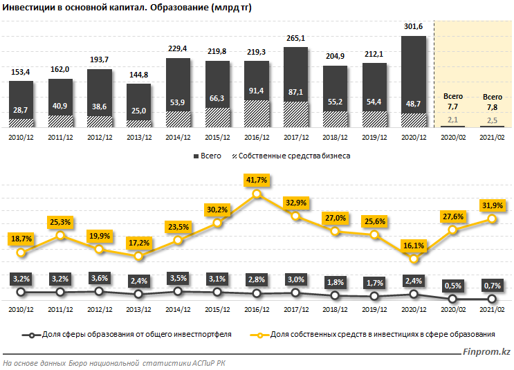Впрочем, по итогам всего 2020 года финансирование сферы образования из собственных средств инвесторов составило всего 48,7 млрд тг — на 10,5% меньше, чем в 2019 году. Это лишь 16,1% от общего объёма инвестиций в секторе, против 25,6% годом ранее.