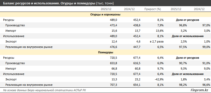 "Общие данные по производству огурцов — не только тепличных, но и выращенных в открытом грунте — говорят о том, что Казахстан почти полностью обеспечивает себя этими овощами. И спрос на огурцы на внутреннем рынке увеличивается. За 2025 год доля отечественного производства этих овощей составила 96,8% от общих ресурсов. Импорт был совсем небольшим: всего 3,2%", - отмечают аналитики.