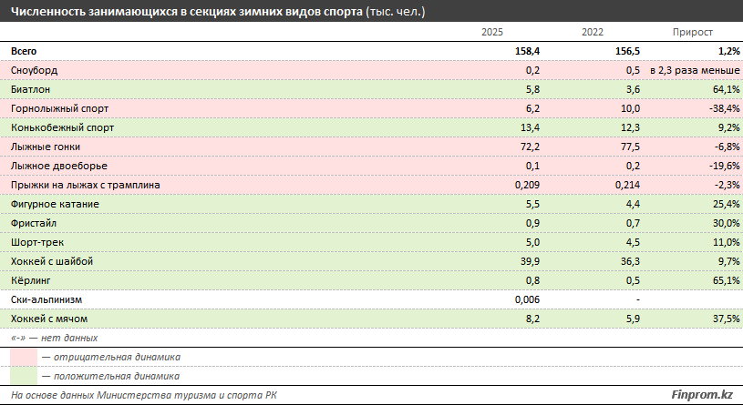 Согласно данным Министерства туризма и спорта РК, с 2022 по 2025 год численность казахстанцев, регулярно посещающих секции 14 зимних видов спорта (13 олимпийских и одного неолимпийского), практически не изменилась и составила 158,4 тыс. человек. Рост всего на 1,2% указывает скорее на перераспределение внутри видов спорта, чем на массовый приток новых спортсменов.