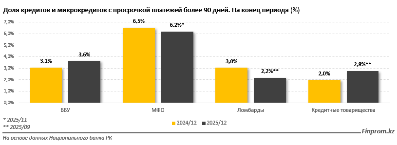 В то же время у кредитных товариществ ситуация ухудшилась: удельный вес проблемных займов вырос с 2% в декабре 2024 года до 2,8% в сентябре 2025-го.