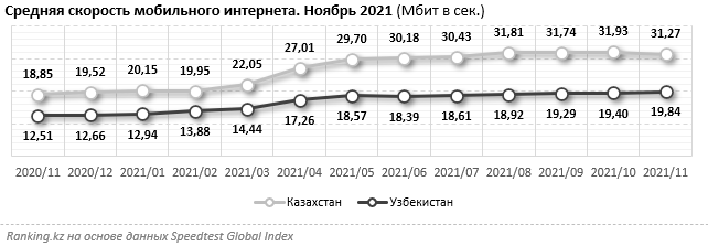 По итогам ноября текущего года, по данным Speedtest Global Index, средняя скорость мобильного интернета в Казахстане достигла 31,27 Мбит в секунду. Годом ранее показатель составлял лишь 18,85 Мбит в секунду. Для сравнения: это более чем в полтора раза выше, чем в соседнем Узбекистане, где скорость составляет лишь 19,84 Мбит в секунду.