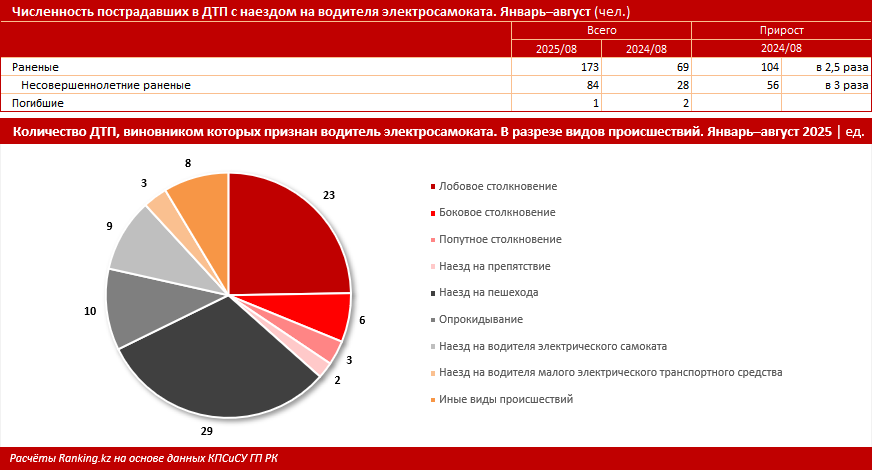 "За январь–август текущего года было зарегистрировано 29 таких аварий — в 2,2 раза больше, чем за соответствующий период 2024-го. Второе место по количеству ДТП, произошедших по вине арендаторов электросамокатов, заняли лобовые столкновения: 23 случая — почти в 4 раза больше, чем годом ранее", - пишет Ranking.kz.