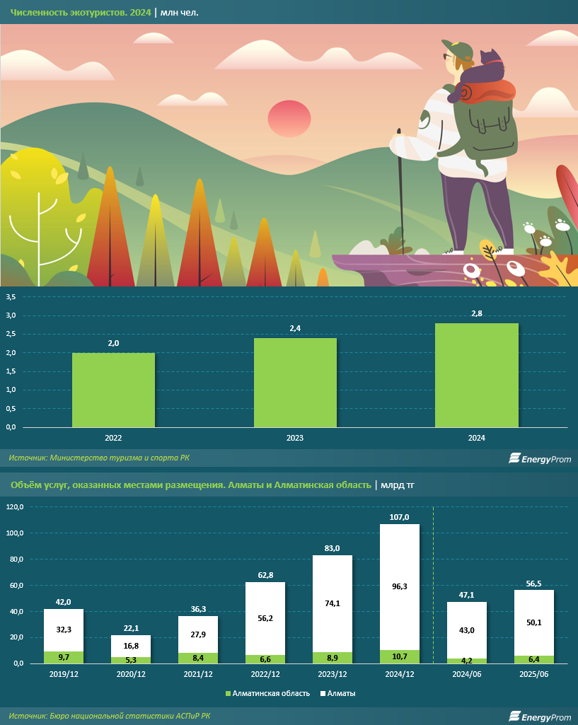 "Именно территория Алматинской агломерации занимает лидирующие позиции в туристическом секторе Казахстана как по численности туристов, так и по финансовым показателям. По данным Бюро национальной статистики АСПиР РК, в январе–июне текущего года доля Южной столицы и близлежащей области в общем объёме услуг, оказанных местами размещения, составила 37,4%, или 56,5 млрд тг", - пишет Еnergyprom.kz.