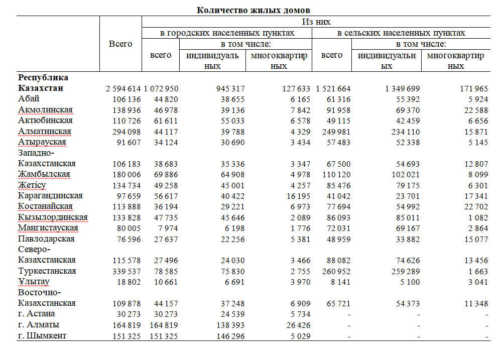 Региональная структура жилищного фонда показывает значительную концентрацию домов в южных регионах. Самое большое количество жилых домов зарегистрировано в Туркестанской области — 339,5 тыс. единиц, а также в Алматинской области — 294 тыс. единиц. Среди городов лидером остается Алматы, где насчитывается 164,8 тыс. жилых домов. В сельской местности наибольшее количество жилья сосредоточено в Туркестанской области — 260,9 тыс. единиц, что связано с высокой плотностью сельского населения.