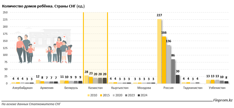 "По количеству домов ребёнка Казахстан в СНГ занимает второе место после России. В 2024 году в РК насчитывалось 20 таких организаций — на 28,6% меньше, чем 14 лет назад, в 2010-м", - говорится в исследовании.