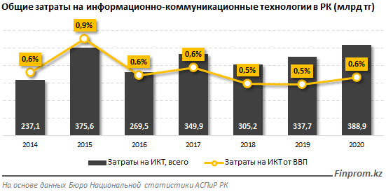 Кроме того, за последние годы расходы, направленные на информационно-коммуникационные технологии в стране, остаются практически на одном уровне. Так, в 2020 году доля расходов на ИКТ от ВВП страны составила всего 0,6%, в 2016-2019 годах — также 0,5%–0,6%. Максимальное значение наблюдалось в 2015 году — 0,9%.