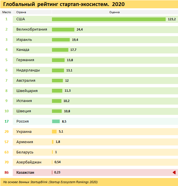 Так, в глобальном рейтинге стартап-экосистем 2020 года Казахстан занял 86-е место среди 100 стран. Фактически республика вошла в 15 аутсайдеров рейтинга. Кроме того, по сравнению с предыдущим годом страна опустилась на 17 строчек, что свидетельствует об ухудшении ситуации.