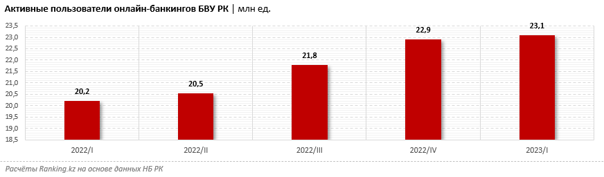 Казахстанцы, в свою очередь, положительно оценили развитие мобильного банкинга: спрос в этом сегменте растёт из года в год высокими темпами. По итогам первого квартала 2023 года количество активных пользователей онлайн-сервисов банков достигло 23,1 млн — на 14,3% больше по сравнению с аналогичным периодом прошлого года.