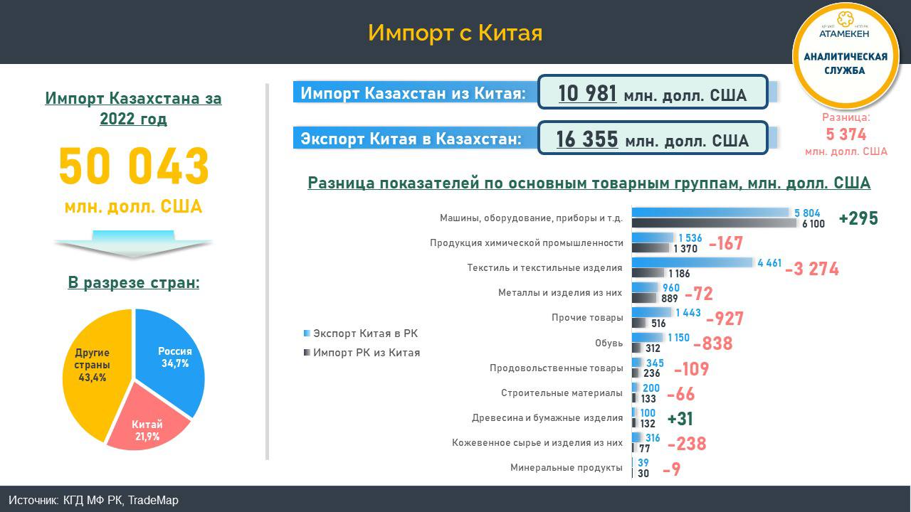 Согласно официальной статистики за 2022 год Казахстан импортировал товаров на 50,0 млрд. долл. США, из которых почти 11,0 млрд долларов или 21,9% пришлись на товары из Китая. В то же время по данным Trademap, со ссылкой на Главное таможенное управление КНР, Китай экспортировал в Казахстан товаров на 16,3 млрд долларов, передает inbusiness.kz со ссылкой на аналитическую службу "Атамекен".