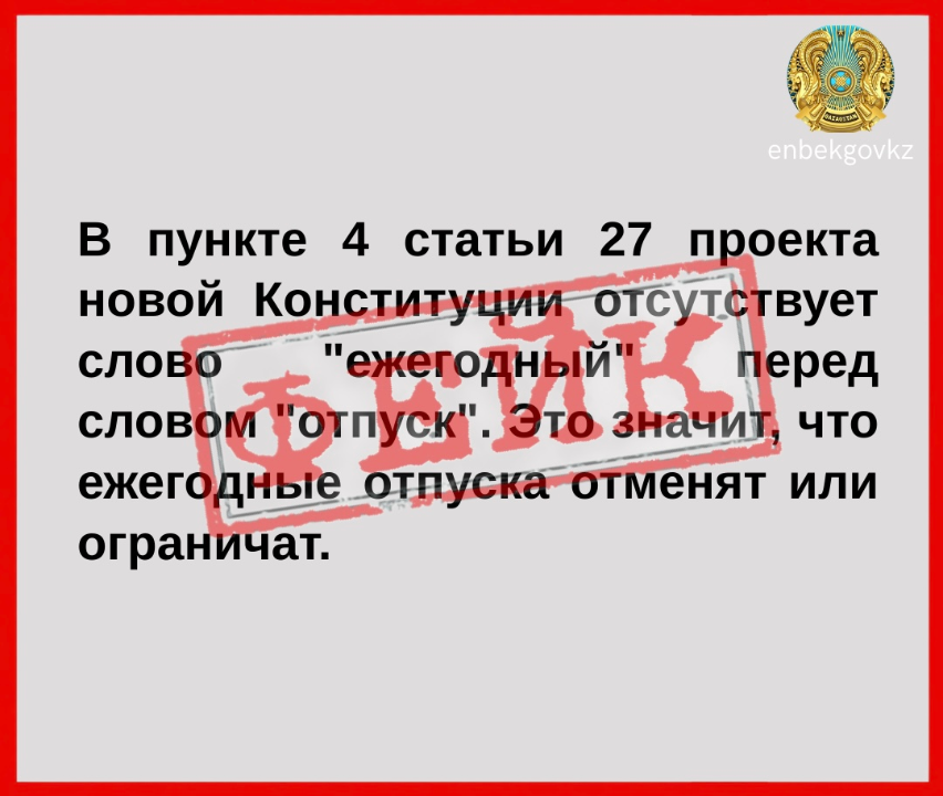 В соответствии с Трудовым кодексом Республики Казахстан, работникам гарантирован ежегодный оплачиваемый трудовой отпуск, установлена его минимальная продолжительность, определён порядок предоставления, а также предусмотрен запрет на не предоставление отпуска. Указанные положения продолжают действовать и не вступают в противоречие с проектом новой редакции Конституции.