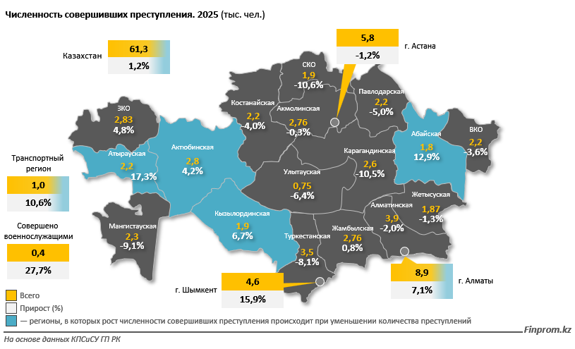 "Указанная тенденция — рост численности преступников при уменьшении количества преступлений — в прошлом году наблюдалась в пяти регионах страны — в Абайской, Актюбинской, Атырауской и Кызылординской областях, а также в Алматы. Аналогичная ситуация была зафиксирована в категории транспортных преступлений, которые рассматриваются отдельно от регионов", - говорится в исследовании.