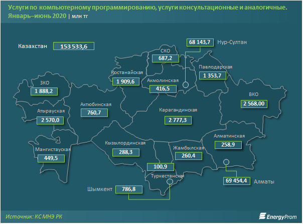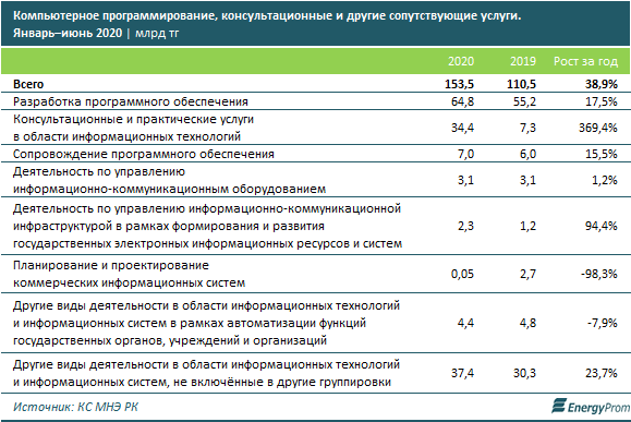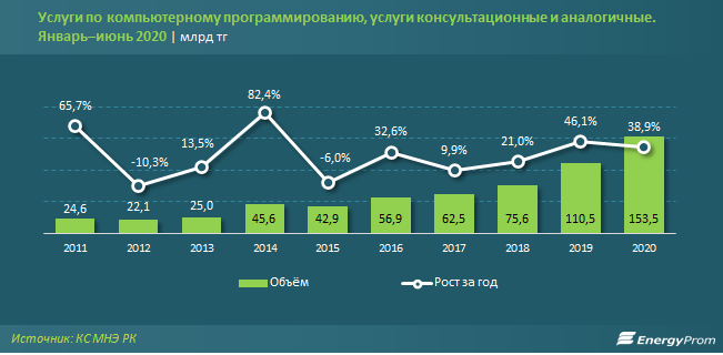Объем услуг по компьютерному программированию, а также консультационным и аналогичным услугам за первое полугодие 2020 года составил 153,5 млрд тг — на 38,9% больше по сравнению с прошлым годом (ИФО — 135%), сообщает energyprom.kz.