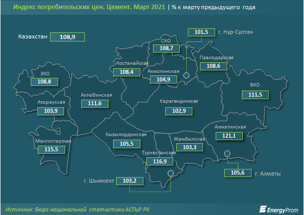 За два месяца с начала года Казахстан отправил на экспорт 282,4 тыс. тонн портландцемента, глинозёмистого, шлакового и суперсульфатного цемента на сумму 13,7 млн долл. США. Рост в натуральном выражении составил 26,3% за год, в денежном — 38,7%.