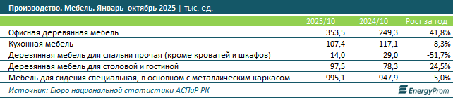 В мебельной промышленности Казахстана фиксируются разнонаправленные тенденции: значительный рост в офисном и гостином сегментах сочетается с падением производства спальной и кухонной мебели. Одновременно меняется структура спроса и импорта - отечественные фабрики укрепляют позиции в ряде категорий, но теряют долю в других, передает inbusiness.kz со ссылкой на energyprom.kz.