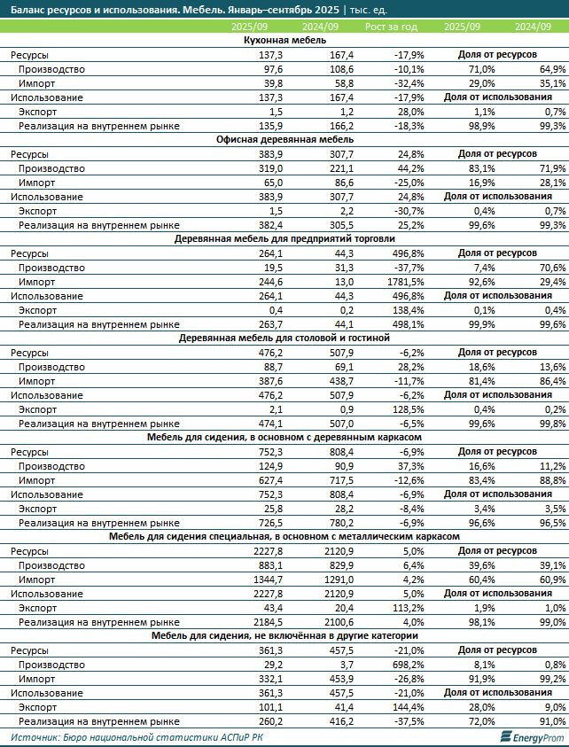Заметно сократилась доля отечественных фабрик в сегменте деревянной мебели для предприятий торговли. Так, казахстанские мебельщики обеспечили спрос на неё лишь на 7,4% за январь–сентябрь текущего года, против 70,6% за аналогичный период 2024-го. Импорт показал рост сразу в 18,8 раза, до 244,6 тыс. единиц, а реализация на внутреннем рынке увеличилась сразу в 6 раз, до 263,7 тыс. единиц.