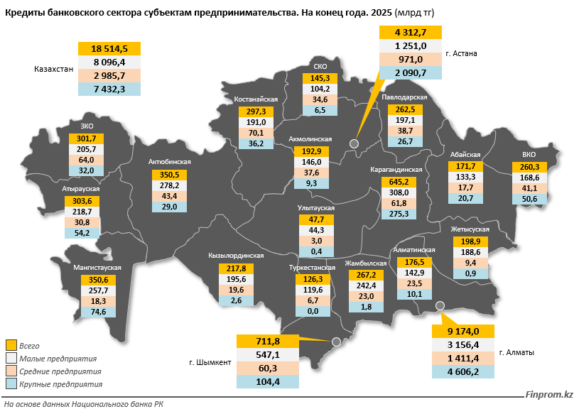 Регионально кредитный портфель остается высоко концентрированным. Почти 73% всех займов бизнесу на конец 2025 года приходилось на Алматы (9,2 трлн тенге) и Астану (4,3 трлн тенге). В этих городах преобладает крупный бизнес - его доля составляет 50,2% портфеля в Алматы и 48,5% в Астане. Высокая концентрация крупных предприятий также отмечена в Карагандинской области, где на них приходится 42,7% кредитов, что связано с развитой промышленной базой региона.
