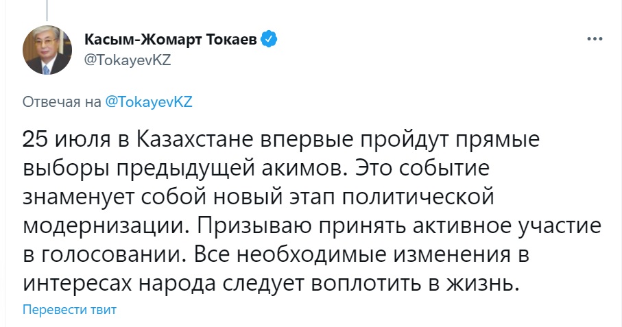 "25 июля в Казахстане впервые пройдут прямые выборы сельских акимов. Это событие знаменует собой новый этап политической модернизации. Призываю избирателей принять активное участие в голосовании. Все необходимые преобразования в интересах народа следует воплотить в жизнь", – написал Касым-Жомарт Токаев в Twitter.