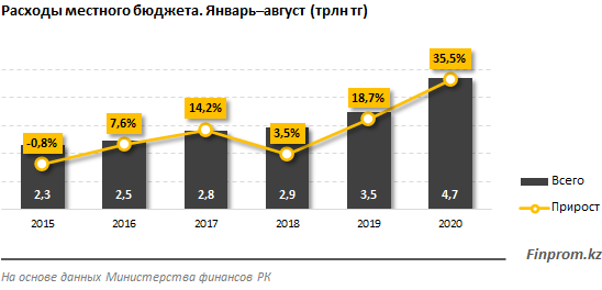 За январь–август 2020 года расходы местного бюджета страны достигли 4,7 трлн тг — сразу на 35,5% больше, чем годом ранее. Для сравнения: за январь-август 2019 года расходы местного бюджета составляли 3,5 трлн тг, увеличившись за год на 18,7%, сообщает finprom.kz.