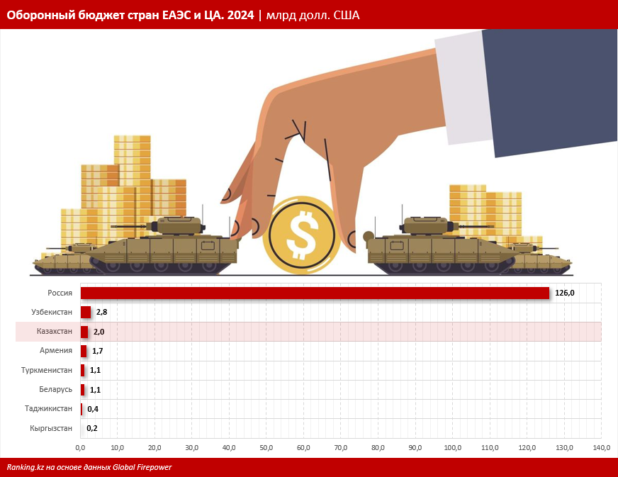 Согласно отчёту Global Firepower за 2025 год, оборонный бюджет России составляет 126 млрд долл. Среди стран ЕАЭС и Центральной Азии следом идёт Узбекистан с бюджетом в 2,8 млрд долл. В Казахстане на оборонные расходы приходится 2 млрд долл., в Армении — 1,7 млрд долл.