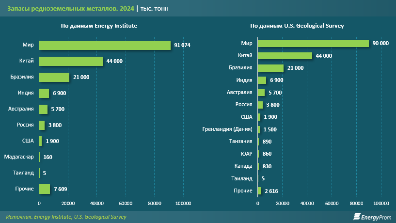 Мировые запасы редкоземельных металлов в 2024 году оценивались примерно в 90–91 млн тонн. Лидерство оставалось за Китаем, который располагает около 44 млн тонн. На последующих позициях находятся Бразилия (21 млн тонн), Индия (6,9 млн тонн), Австралия (5,7 млн тонн) и Россия (3,8 млн тонн). США имеют примерно 1,9 млн тонн, Мадагаскар - около 160 тыс. тонн, а Таиланд - всего 5 тыс. тонн. На остальные государства, по разным оценкам, приходится от 2,6 до 7,6 млн тонн.