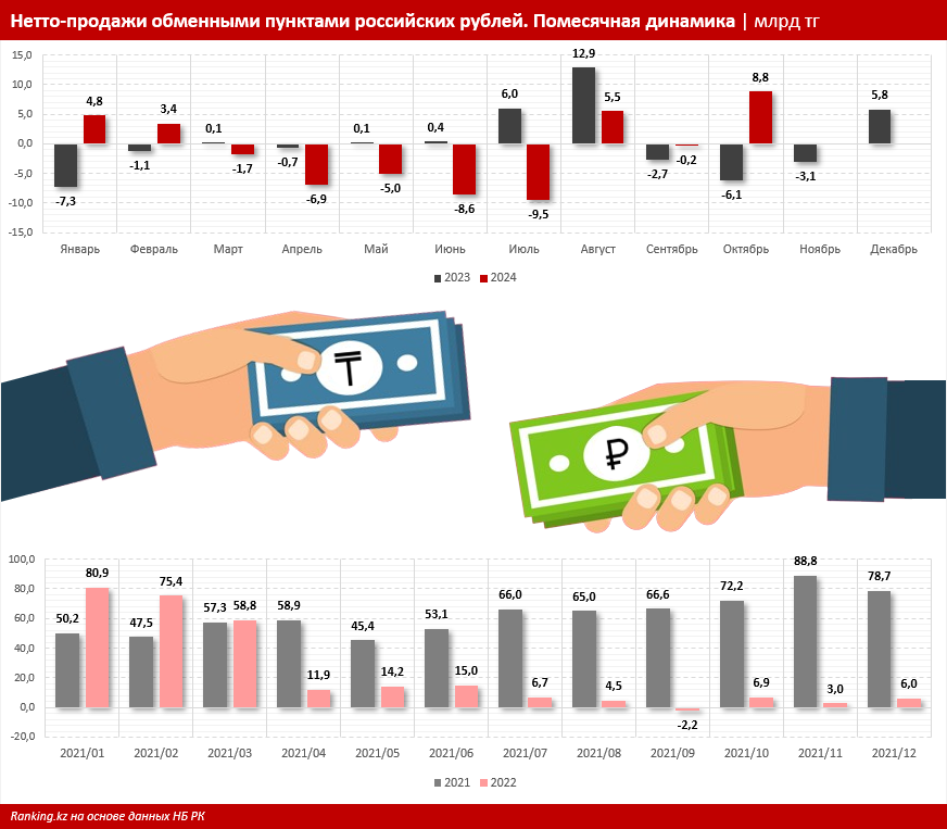 "В целом с началом военных действий России в Украине интерес казахстанцев к рублю значительно упал. Так, ещё в 2021 году среднемесячный объём нетто-продаж российских рублей варьировался от 45,4 млрд до 88,8 млрд тг, а в 2022-м он составил 80,9 млрд тг в январе, 75,4 млрд тг в феврале и 58,8 млрд тг в марте. С апреля 2022 года и до объявления в августе мобилизации в России нетто-продажи сократились с 11,9 млрд до 4,5 млрд тг, а уже в сентябре объём сданных в обменные пункты российских рублей впервые превысил объём купленных, нетто-продажи составили минус 2,2 млрд тг", - говорится в исследовании.