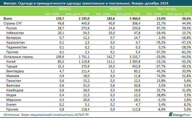 В свою очередь, импорт из стран, не входящих в СНГ, сократился на 23%, составив 109,9 тыс. тонн. Основные поставщики — Китай (85,5 тыс. тонн), Турция (15,3 тыс. тонн) и Бангладеш (4,7 тыс. тонн).
