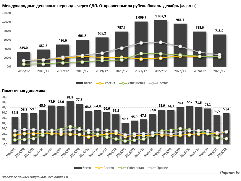 По итогам 12 месяцев прошлого года объём денежных переводов, отправленных из Казахстана за рубеж физическими лицам через системы международных денежных переводов (СДП), составил 718,9 млрд тг — на 8,8% меньше, чем за январь–декабрь 2024-го. Показатель сокращается уже третий год подряд, передает inbusiness.kz со ссылкой на Finprom.kz.