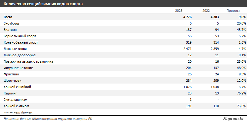 К концу прошлого года в Казахстане насчитывалось около 4,8 тыс. секций зимних видов спорта - это на 9% больше, чем в 2022 году. Такая динамика указывает на системные усилия по развитию и популяризации зимнего спорта. Однако в ряде дисциплин рост числа секций не сопровождается увеличением интереса со стороны спортсменов.