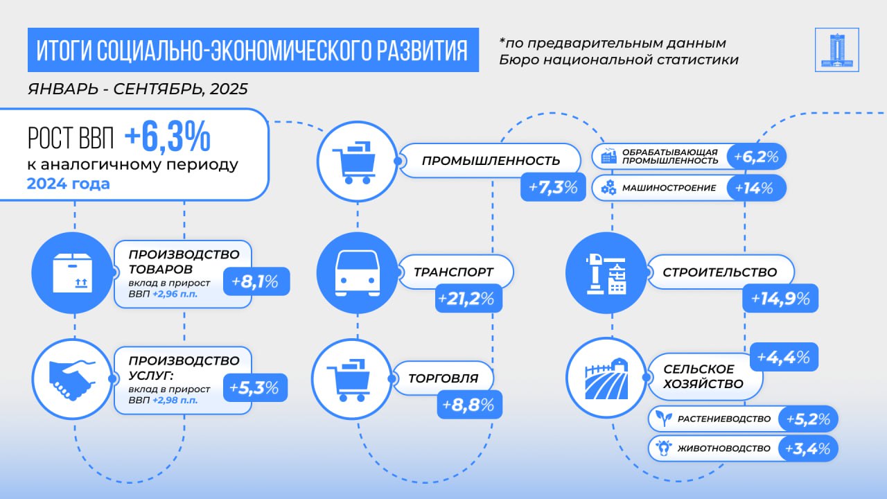 Рост экономики Казахстана по итогам 9 месяцев 2025 года составил 6,3%, передает inbusiness.kz.