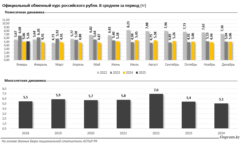 Официальный обменный курс российского рубля по итогам января текущего года составил в среднем 5,16 тг — на 2% выше, чем месяцем ранее и в январе 2024 года. По сравнению с январём 2023-го курс снизился на 22,8%, а по сравнению с январём 2022 года, до периода геополитической напряжённости — на 9%.