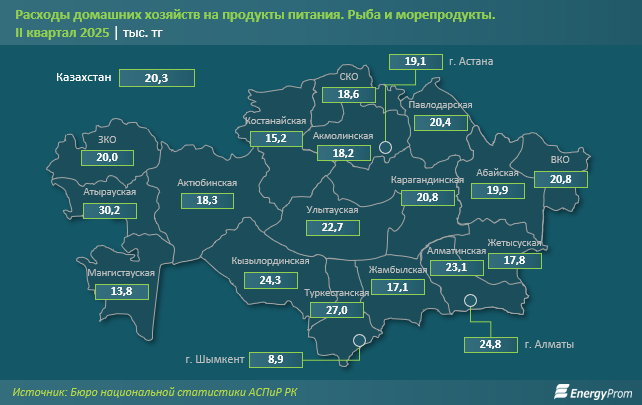 По данным Еnergyprom.kz, расходы домашних хозяйств на рыбу и морепродукты во втором квартале текущего года составили 20,3 тыс. тг — на 8,4% больше, чем в аналогичном периоде 2024-го.