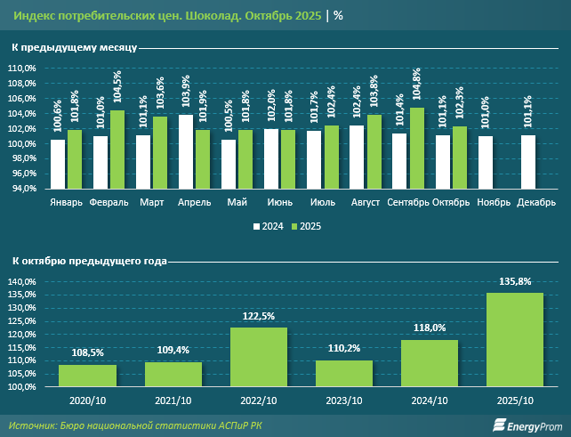 По итогам октября 2025 года шоколад в Казахстане подорожал на 2,3% за месяц. Месяцем ранее рост был значительно резче - 4,8%, что стало вторым по величине скачком цен за всю историю наблюдений. Максимальное месячное удорожание - 5% - было зафиксировано в ноябре 2015 года. Рост цен продолжается уже 78 месяцев подряд.