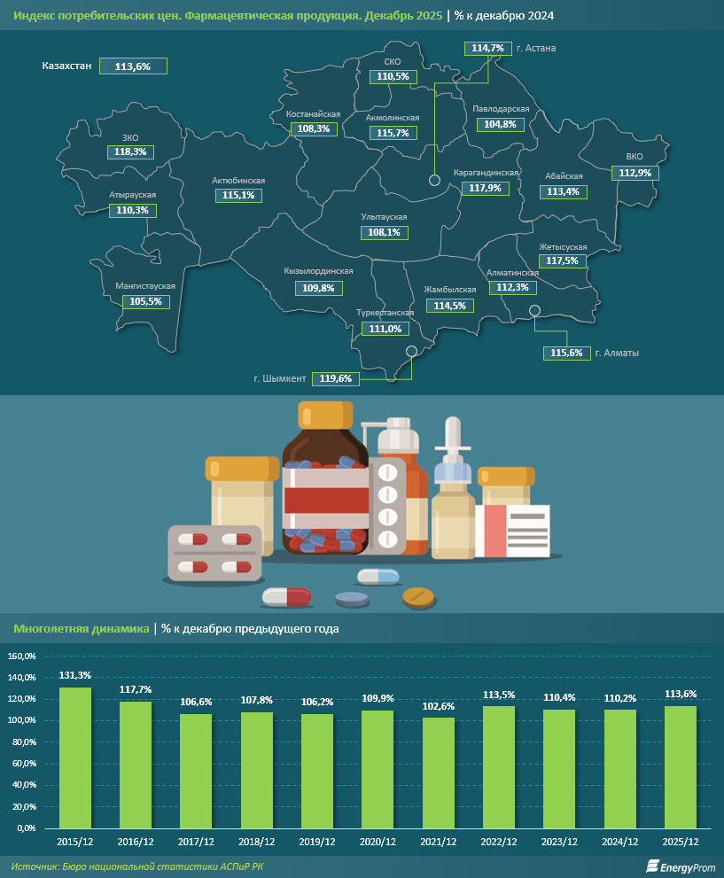 "Наибольшее удорожание в секторе по итогам декабря 2025 года было зафиксировано в Шымкенте: на 19,6%. Высокие темпы роста цен также наблюдались в Западно-Казахстанской (на 18,3%), Карагандинской (на 17,9%) и Жетысуской (на 17,5%) областях. Минимальное удорожание фармацевтической продукции за год было отмечено в Павлодарской (на 4,8%), Мангистауской (на 5,5%), Улытауской (на 8,1%) и Костанайской (на 8,3%) областях", - говорится в исследовании.