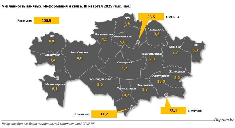 Далее расположились Алматы и Алматинская область. Наименьшие показатели численности занятых в сфере информации и связи пришлись на Улытаускую, Северо-Казахстанскую и Кызылординскую области.