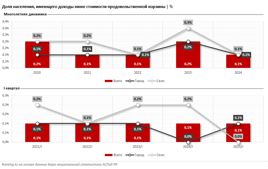 В Казахстане, по данным бюро национальной статистики АСПиР РК, доля населения, имеющего доходы ниже стоимости продовольственной корзины, в прошлом году составила 0,1%, против 0,2% в 2023-м. При этом в 2024 году и в городской местности, и на селе показатели оказались одинаковыми, в то время как в 2023-м удельный вес населения, имеющего доходы ниже стоимости продовольственной корзины, составлял 0,2% в городской и 0,3% в сельской местности.