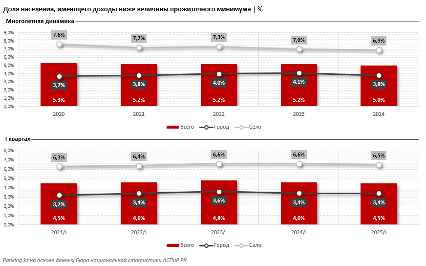 В первом квартале текущего года удельный вес казахстанцев, живущих на доходы ниже величины прожиточного минимума, составил 4,5% (в аналогичном периоде 2024-го — 4,6%). Величина прожиточного минимума в среднем на душу населения в первом квартале 2025 года составила 52,5 тыс. тг в месяц.