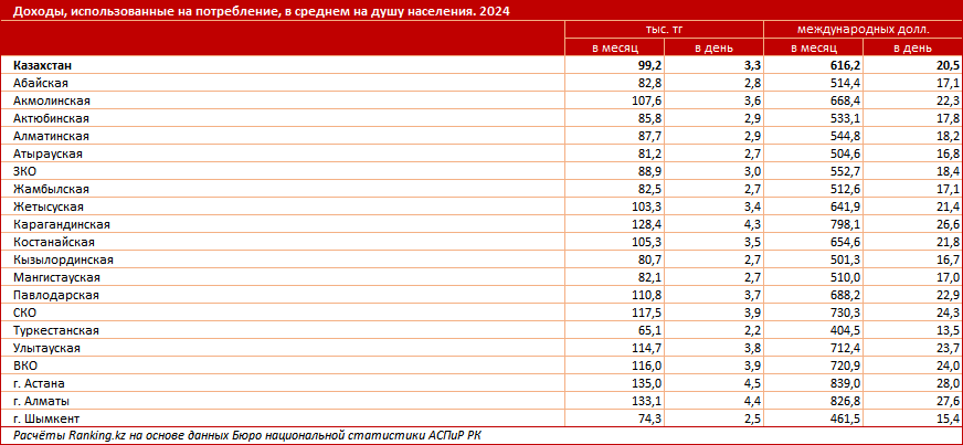 Между тем доходы, использованные на потребление, в 2024-м составили 99,2 тыс. тг в среднем на душу населения в месяц, или 3,3 тыс. тг в день (7 долл. США по среднему курсу за прошлый год). При этом в пересчёте на международные доллары, использующиеся для определения уровня крайней бедности, казахстанцы в среднем в день тратили на потребление сумму, эквивалентную 20,5 международного доллара. Согласно данным Всемирного банка, международный доллар стоил 160,93 тг, то есть на эту сумму в Казахстане можно было купить тот же набор товаров и услуг, который в США обошёлся бы в 1 долл. США.