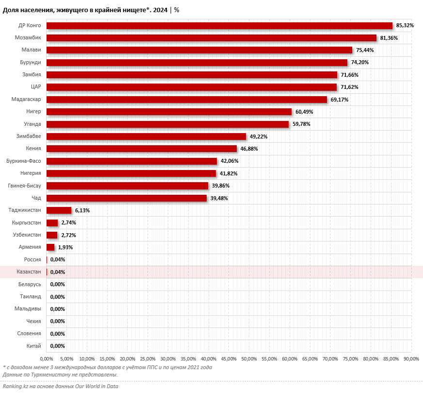 Среди государств ЦА и ЕАЭС самый высокий уровень крайней бедности пришёлся на Таджикистана: 61,3% населения этой страны жили менее чем на 3 международных доллара в день. Следом с кардинально отличающимися показателями идут Кыргызстан (2,74%), Узбекистан (2,72%) и Армения (1,93%). В России и Казахстане ситуация разительно лучше, здесь наблюдаются совсем небольшие доли населения, живущего в нищете: лишь по 0,04% в каждой из стран. В Беларуси же таковых, если судить также по официальным данным, вообще нет. Данные по Туркменистану отсутствуют.