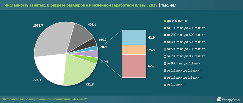 По данным Еnergyprom.kz, в текущем году в Казахстане насчитывается чуть более 1 млн таких граждан, что составило 31,1% от всех занятых. Пятая часть (21,7%) наёмных сотрудников получают от 200 тыс. до 300 тыс. тг, ещё примерно столько же (21,3%) — от 100 тыс. до 200 тыс. тг