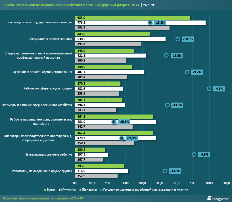 "Статистика в гендерном разрезе показывает, что зарплаты у мужчин в среднем всегда больше, чем у женщин. При этом в разных категориях гендерный разрыв отличается. Например, среди рабочих промышленности разница достигает 26,3%, а в сфере услуг и продаж разрыв минимален: 4,1%", - пишет Еnergyprom.kz.